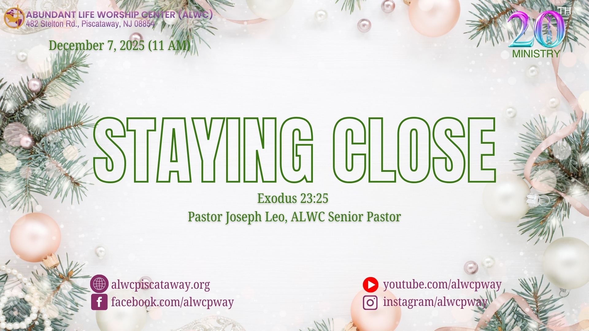 "Staying Close" (Exodus 23:25). Pastor Joseph Leo